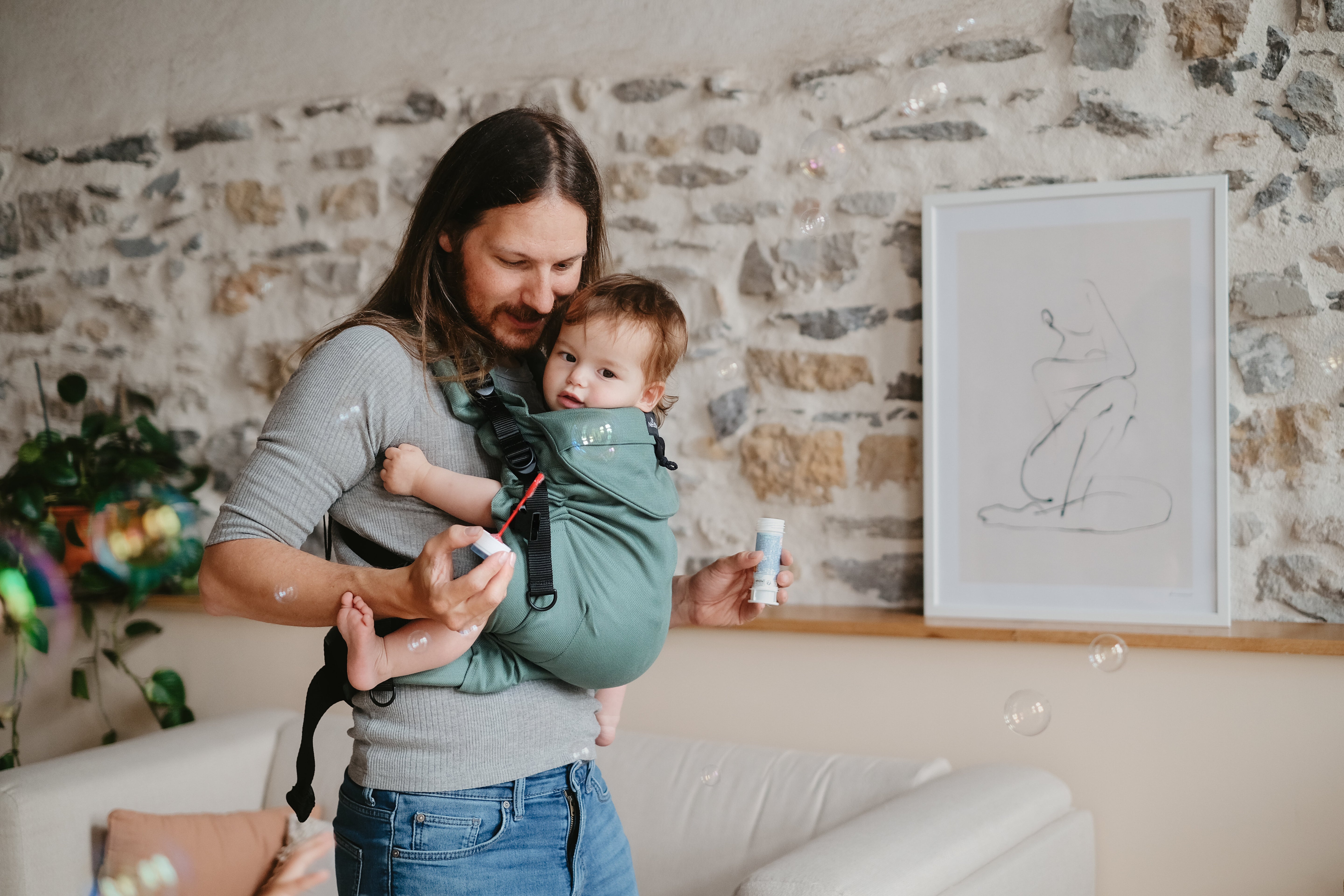 - Confort : le tissu du tablier est le même que celui de nos écharpes tissées pour respecter la position physiologique du bébé et le périnée des parents.