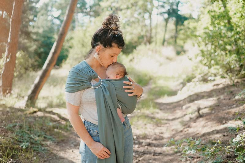Physiologique, le serrage avec les anneaux permet une installation en toute sécurité, bébé est maintenu de façon optimale à hauteur de bisous bien haut sur le buste du porteur pour assurer un confort maximal.