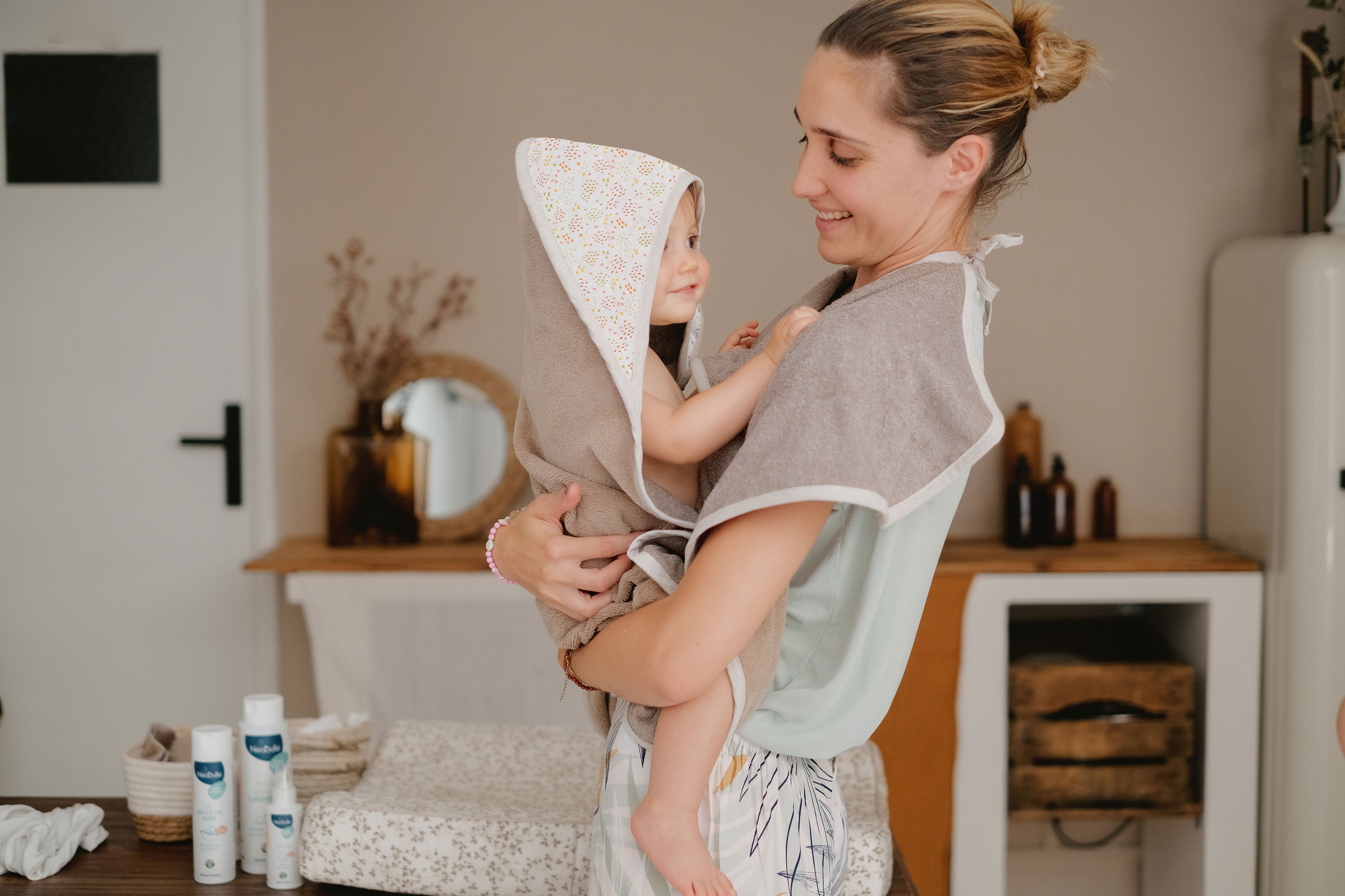 - La serviette tablier Bain Cocon s’enfile autour du cou du parent comme un tablier